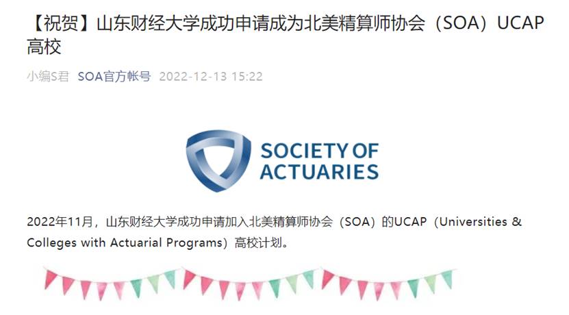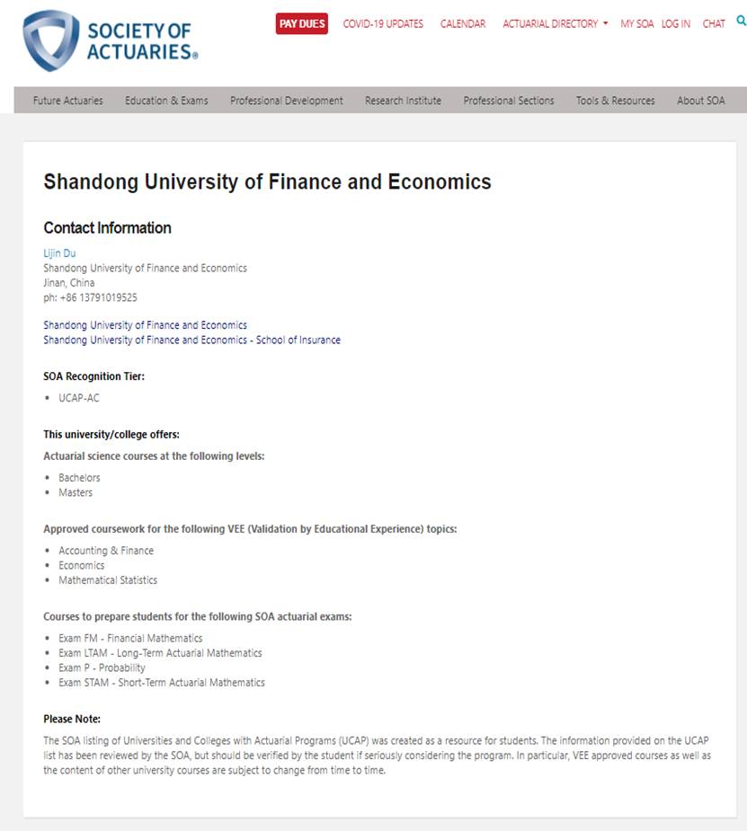 近日,北美精算师协会(Society of Actuaries,简称SOA)官方网站公布,美高梅博彩官方网站 精算学专业正式获得SOA的UCAP高校计划(Universities & Colleges with Actuarial Programs)认证,这进一步提升了我院精算学专业的国内外知名度,也标志着我院精算学专业的本科国际化教育已获得国际认可。