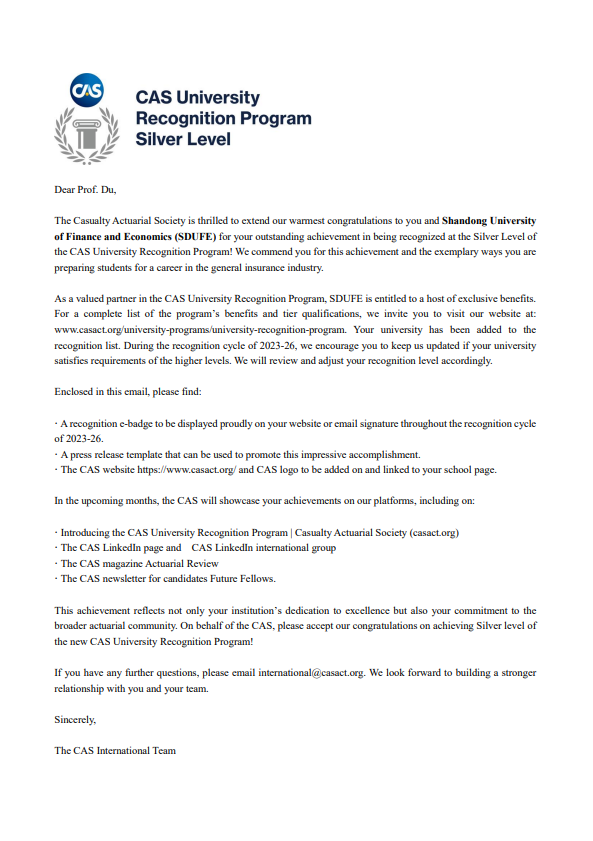 3月14日,北美产险精算师协会(Casualty Actuarial Society,CAS)致函我校,确认山东财经大学精算项目已通过其高校认证项目(University Recognition Program)的严格审核并荣获“Silver Partner”认证。这标志着我校成为中国大陆首批获此殊荣的三所高校之一,彰显了我校在精算教育领域的卓越实力。截至目前,全球共有47所高校通过CAS的高校认证项目,中国大陆仅三所高校,分别为山东财经大学、湖南大学和中央财经大学,获得认证的高校将在精算教育和研究方面得到CAS提供的特别资助。