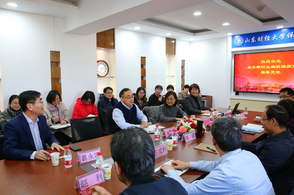 12月24日下午,美高梅博彩 邀请《山东大学学报》(哲学社会科学版)、《山东社会科学》《东岳论从》《理论学刊》《金融发展研究》《经济与管理评论》《山东财经大学学报》七家期刊主编就论文写作与师生交流。美高梅博彩 院长葛永波教授、副院长刘素春教授和于文广教授、科研骨干教师及博士生参加了本次交流会。